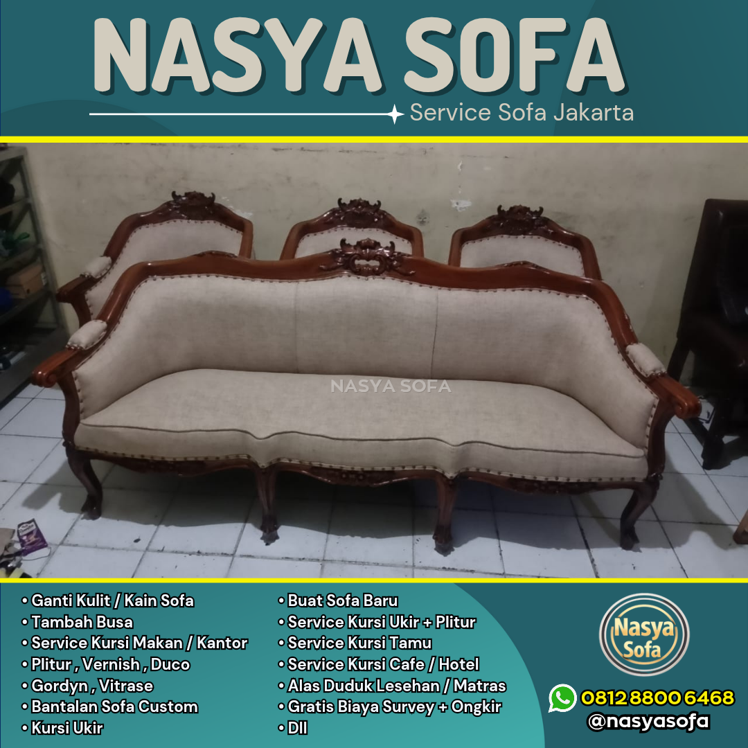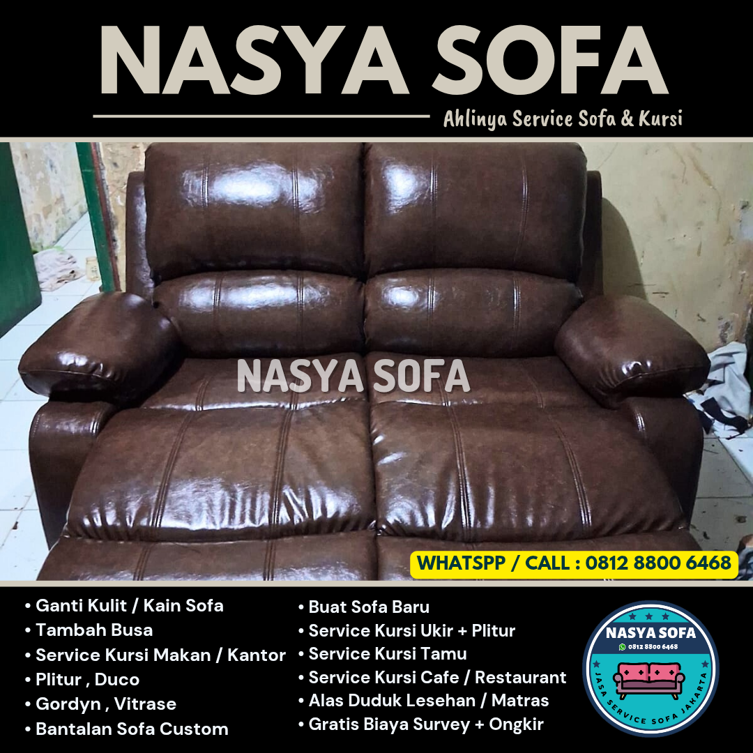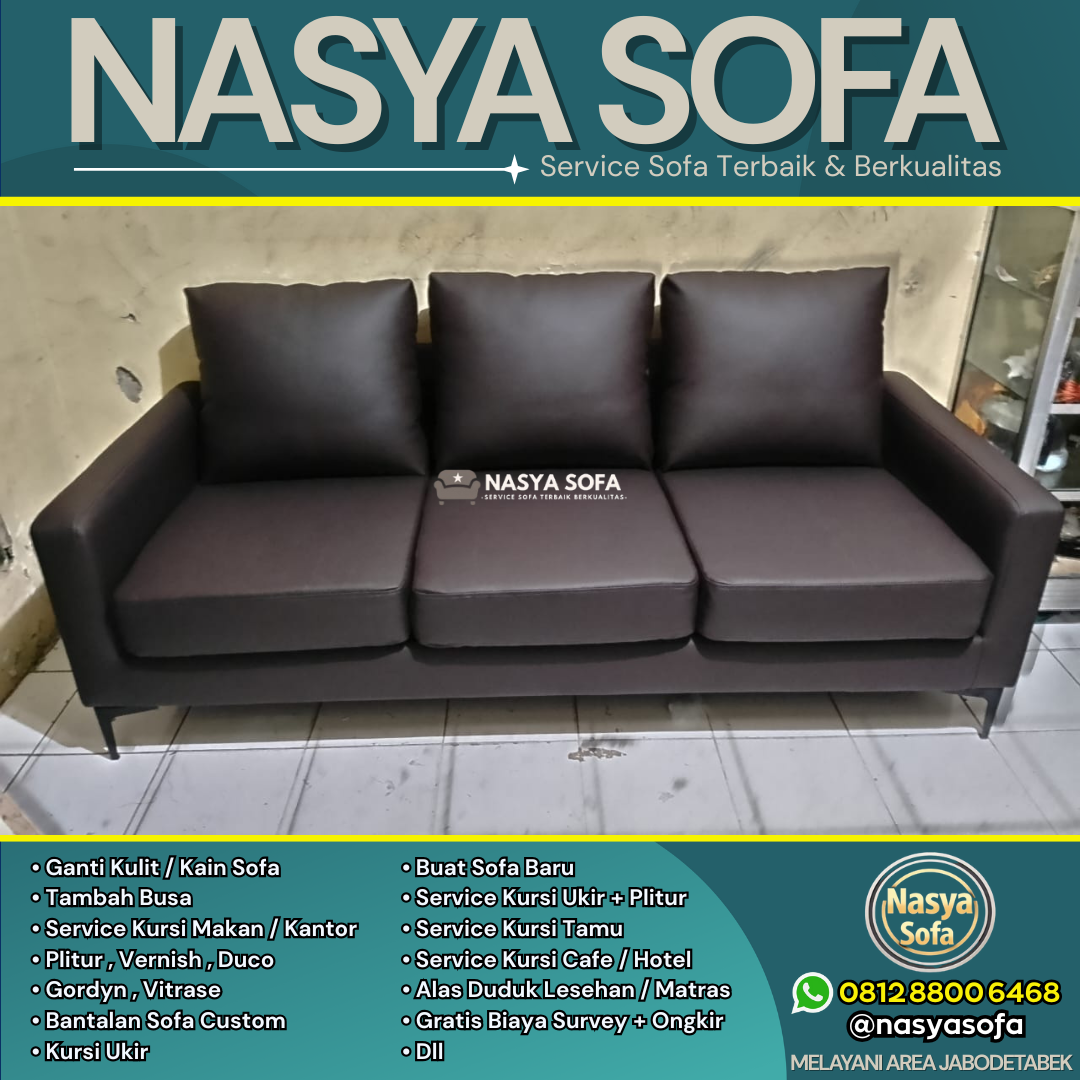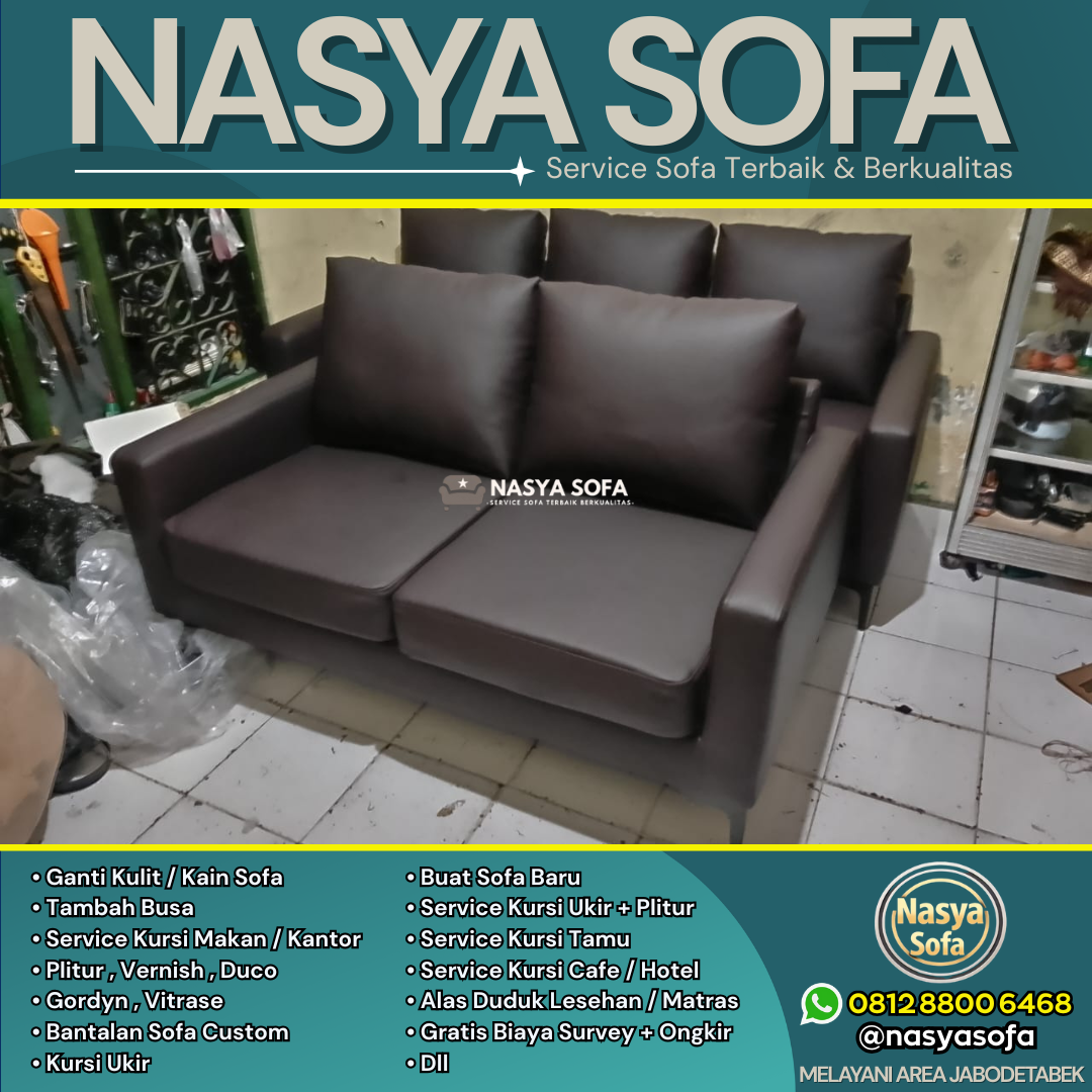 Butuh service sofa terbaik di Jakarta? Nasya Sofa spesialis jasa ganti kain sofa dan jasa ganti kulit sofa dengan hasil seperti baru. Kami melayani perbaikan sofa dan reparasi sofa di seluruh wilayah Jakarta Pusat, Jakarta Selatan, Jakarta Barat, Jakarta Timur, dan Jakarta Utara, didukung material premium dan tim ahli berpengalaman.