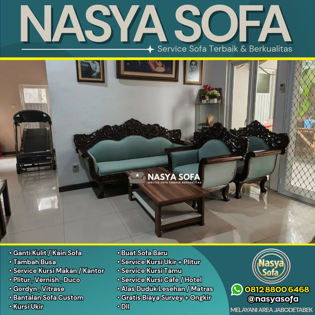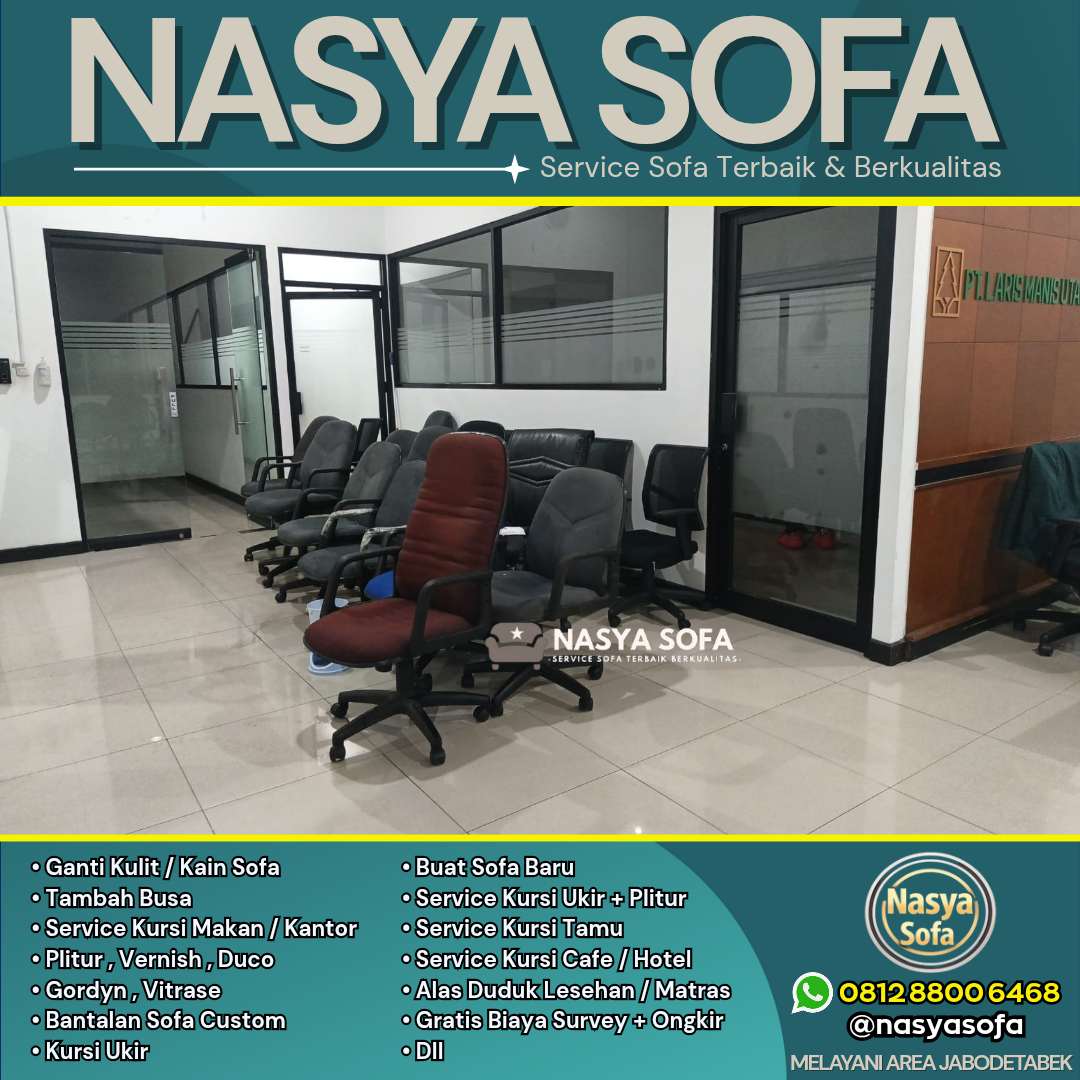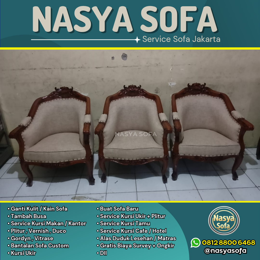 Butuh service sofa terbaik di Jakarta? Nasya Sofa spesialis jasa ganti kain sofa dan jasa ganti kulit sofa dengan hasil seperti baru. Kami melayani perbaikan sofa dan reparasi sofa di seluruh wilayah Jakarta Pusat, Jakarta Selatan, Jakarta Barat, Jakarta Timur, dan Jakarta Utara, didukung material premium dan tim ahli berpengalaman.